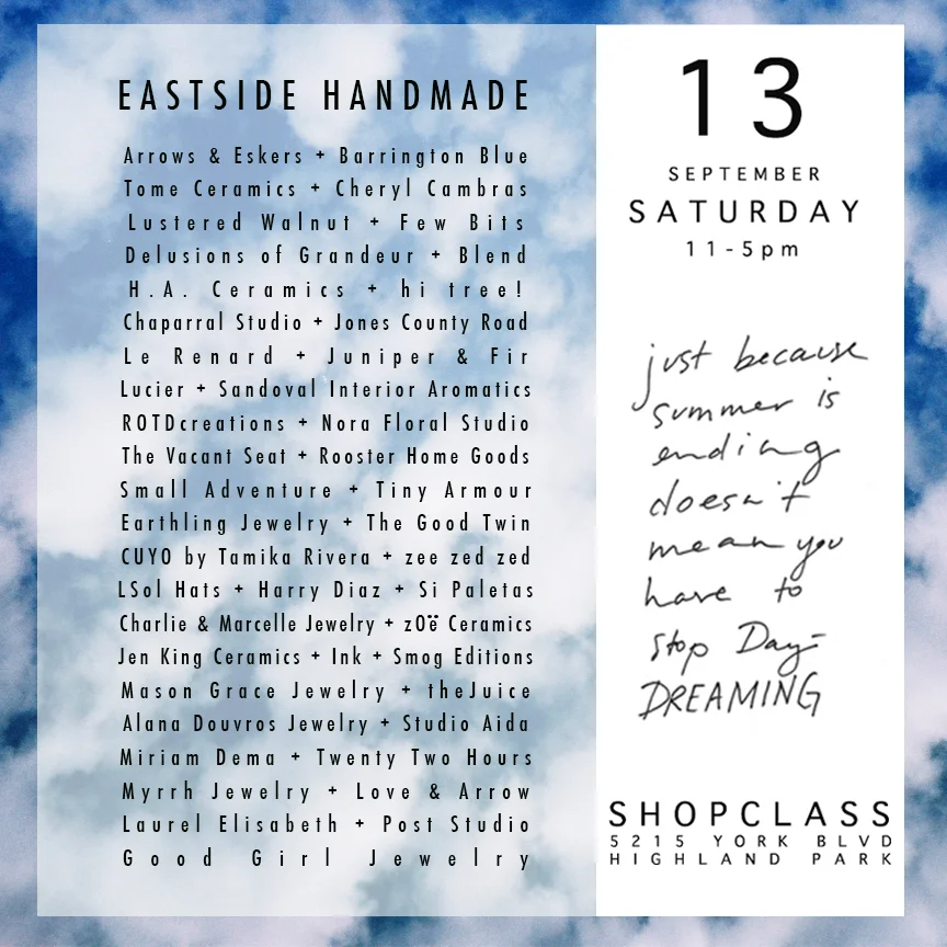 This is our first time at Eastside Handmade and we are very excited to participate! Mingling among other creative minds and talented peeps is my favorite thing to do. Slangin' pillows is a close second. Come see Rooster and the other amazing vendors (listed below) this coming weekend! We'll be behind Shopclass in Highland Park. xxSara